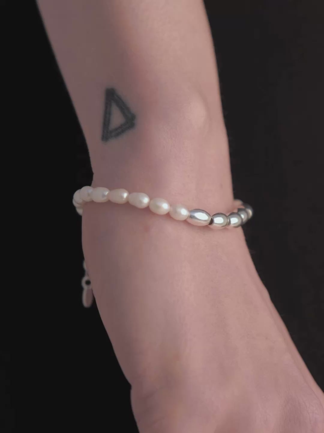 A delicate strand balancing organic pearls with sculptural silver beads. The asymmetric layout creates a soft rhythm across the wrist, bringing texture and quiet contrast.