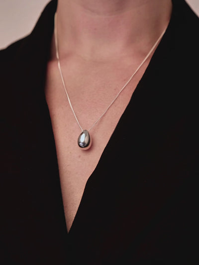 A sculptural pendant designed in a soft teardrop form that sits just below the collarbone. With its rounded volume and mirror polish, it catches and reflects light in motion, creating a subtle yet grounding presence.