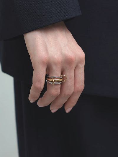 A bold ring composed of three interlocking bands in silver and gold tones, symbolizing balance, connection, and contrast.