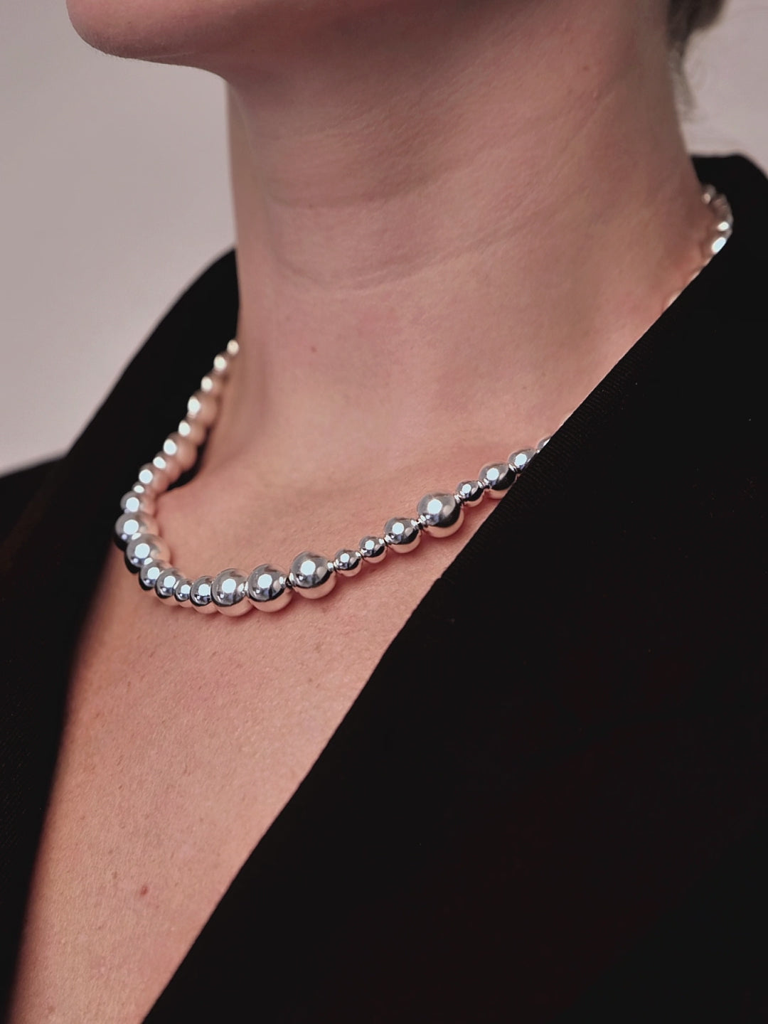 A sculptural strand that graduates from small to bold bead forms, creating a sense of movement and rhythm. Its seamless polish and weight give it an anchored yet flowing presence.