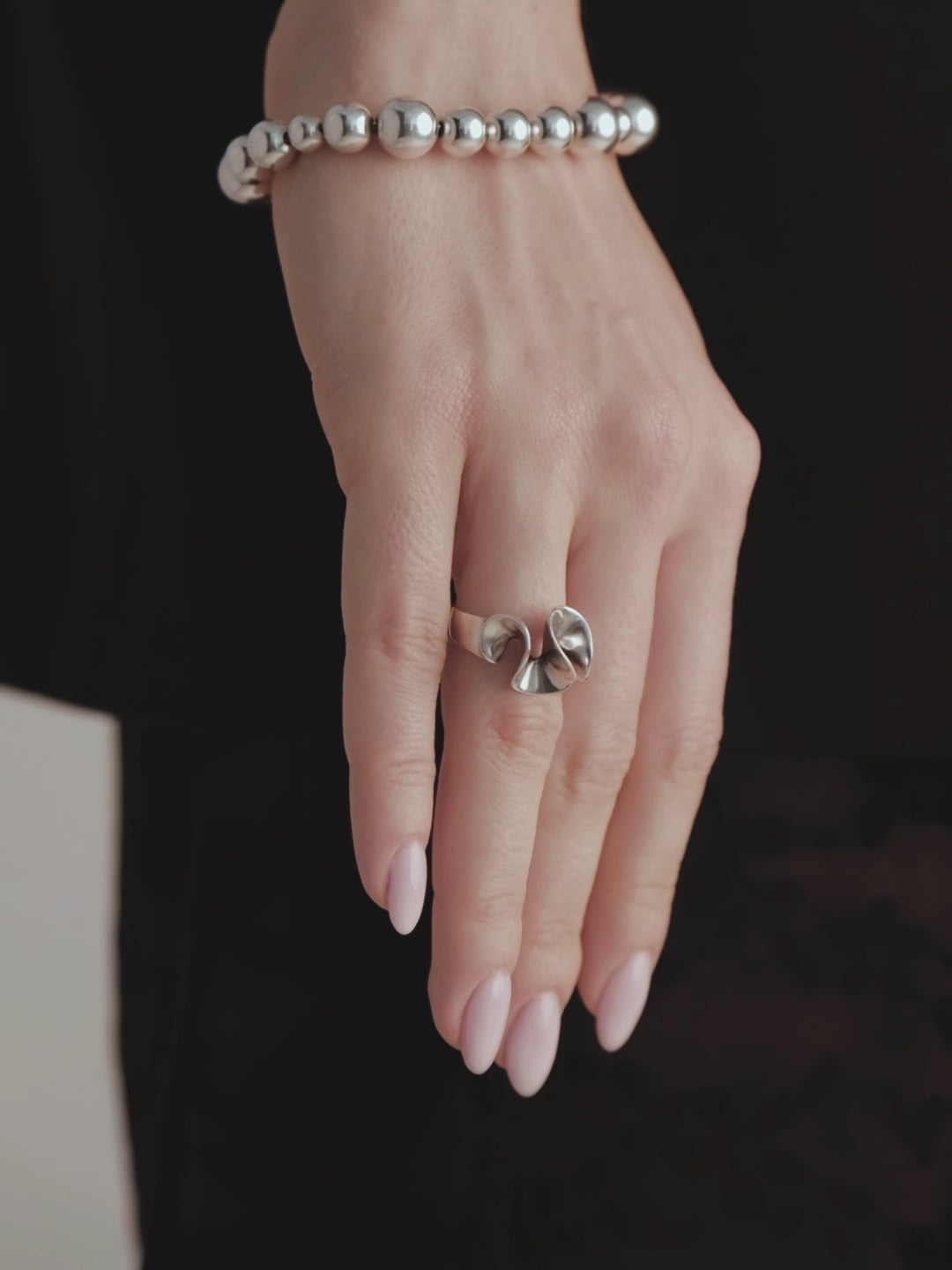 Creates movement and sculptural energy on the hand with a layered interplay of shadow and reflection.
