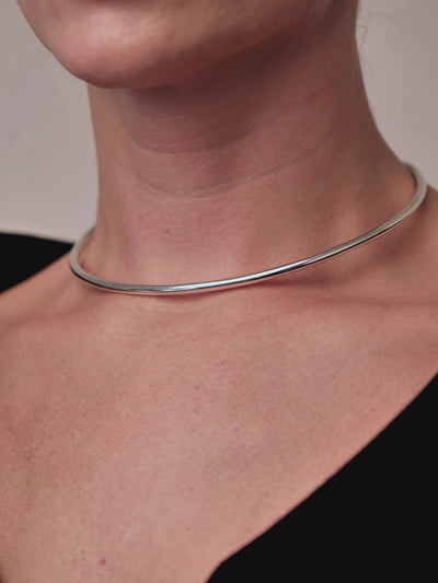 A refined, sculptural choker that traces the neckline with clean curvature and quiet boldness. Its seamless arc and weighty form offer a grounded presence while maintaining a minimalist clarity.