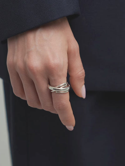A sculptural ring formed by interlacing bands that wrap the finger in layered motion. Its intertwined design creates depth and fluidity, blending structure with softness for a composed, modern statement.