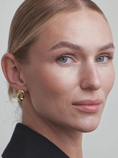 A mini sculptural stud formed by two softly intertwined curves, designed to sit close to the ear and add subtle dimension to the face.